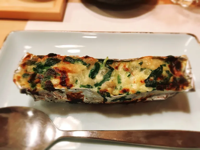海鮮の旨味がホワイトソースに溶け、ほうれん草に絡む。酒が進む危険球。