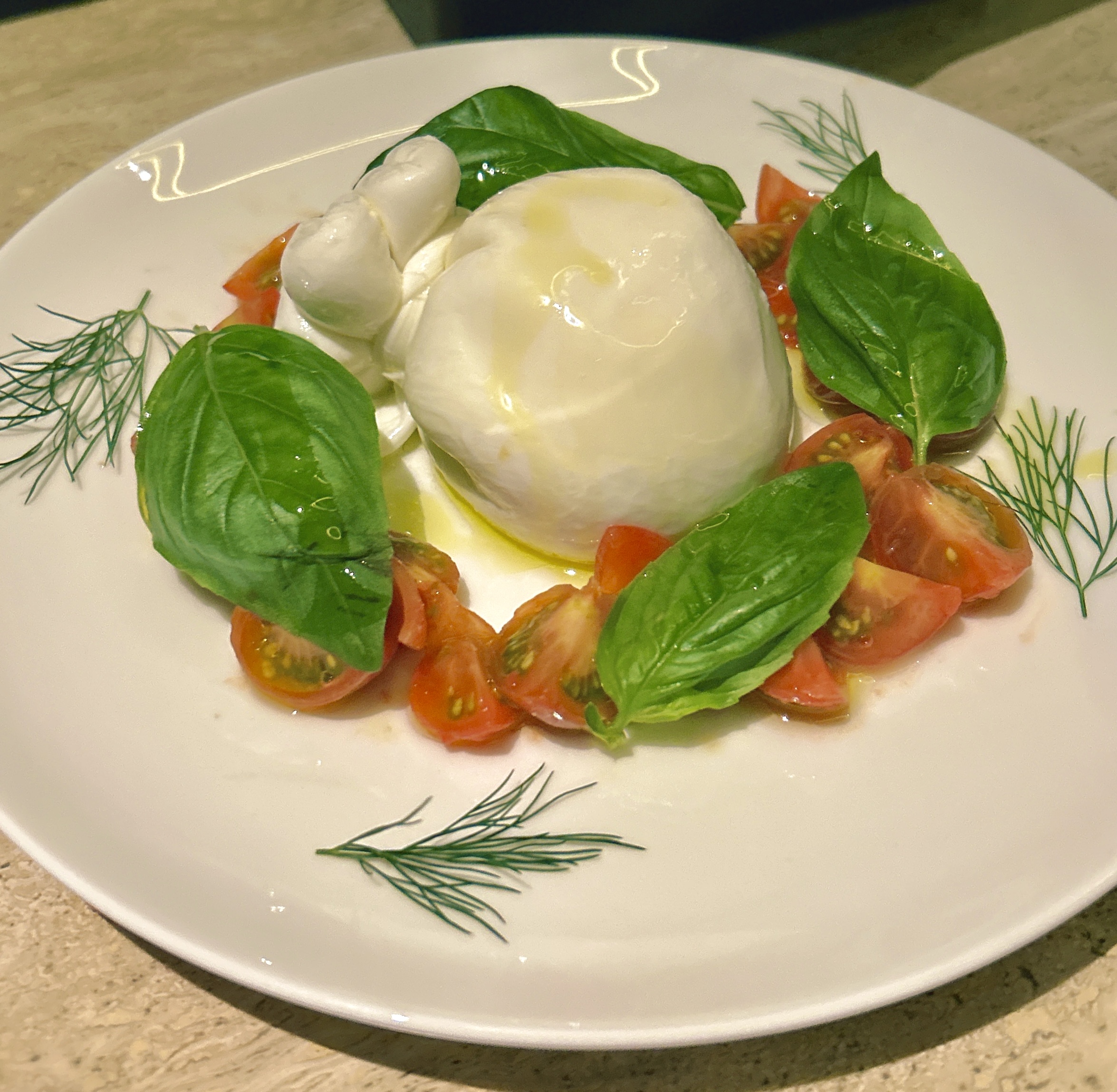 トマトとブッラータの丸ごとカプレーゼ。オリーブオイルの香りが立ちのぼると、誰からともなく「これは白ワインだな」と声が上がる。