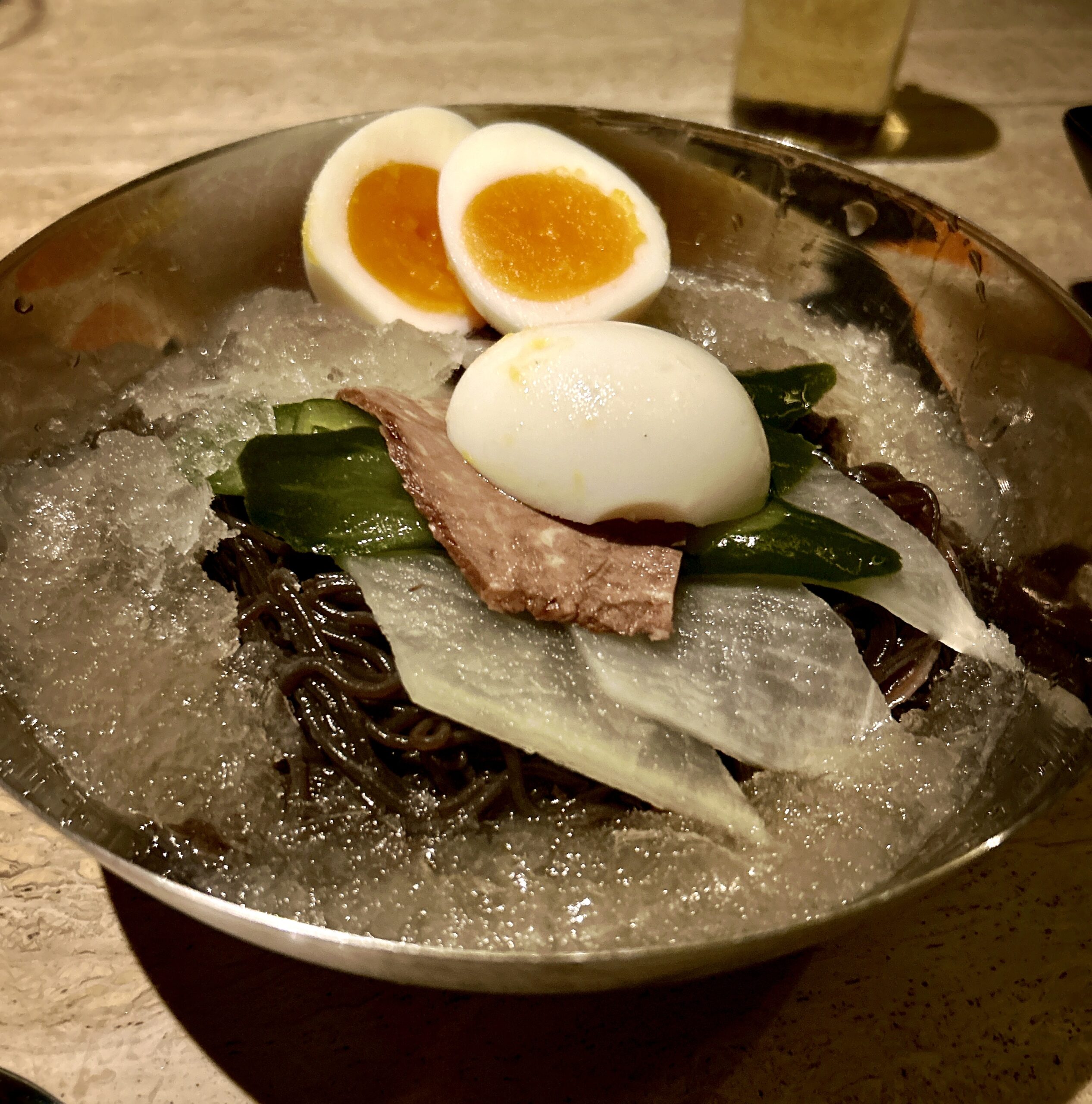 透明な氷に浮かぶ黒い冷麺。「これは絶対うまいやつ」。