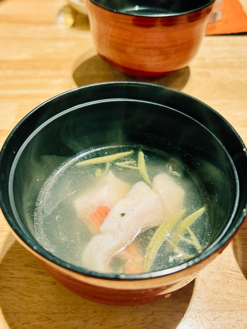 澄んだ出汁に浮かぶ金目鯛のの切り身と細く刻まれた薬味──