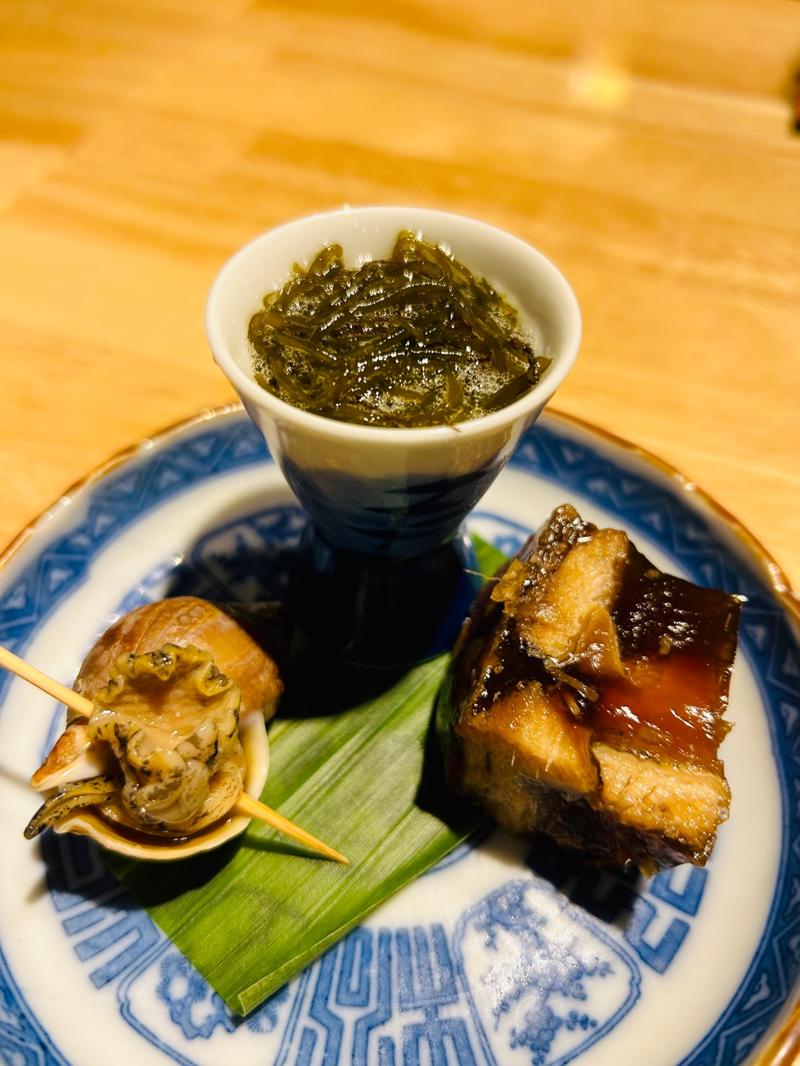【酒肴三点盛り:もずく酢・つぶ貝・煮豚】