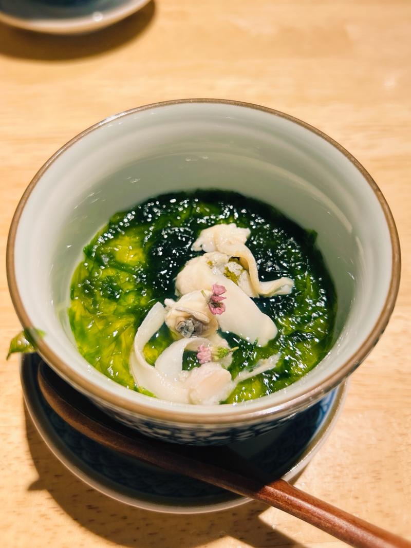 蛤の旨味は濃厚ながらも上品で、あおさのぬめりと磯の香りが、口の中でふわっと広がる。