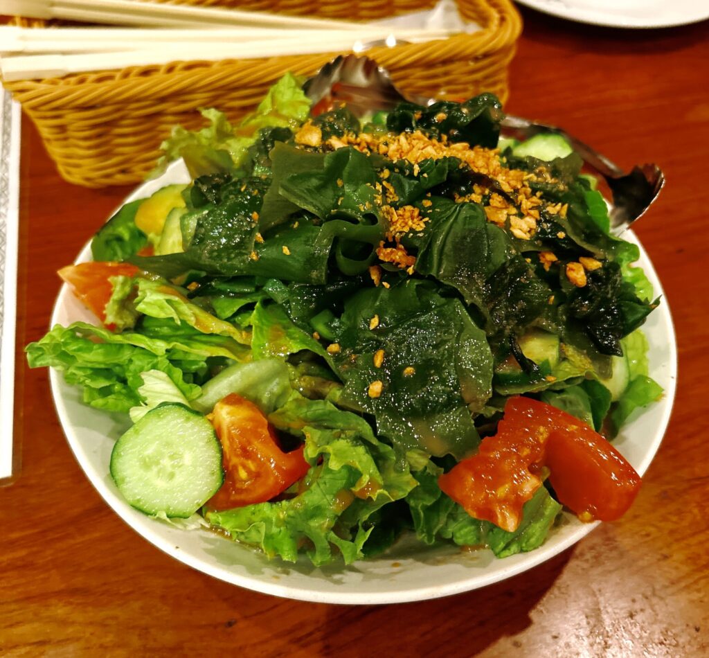 ワカメとにんにくチップの組み合わせが、後の脂ものへの理想的な準備運動となります。