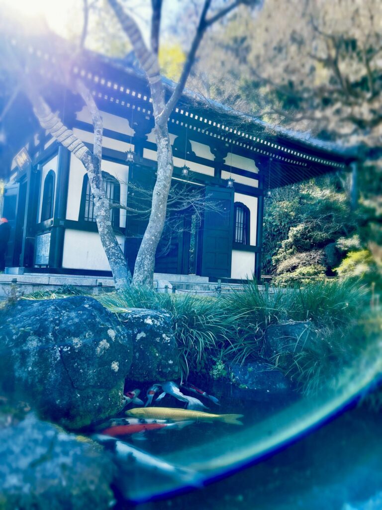 清浄な水のなかの鯉、お堂のたもとで揺れる水面――。