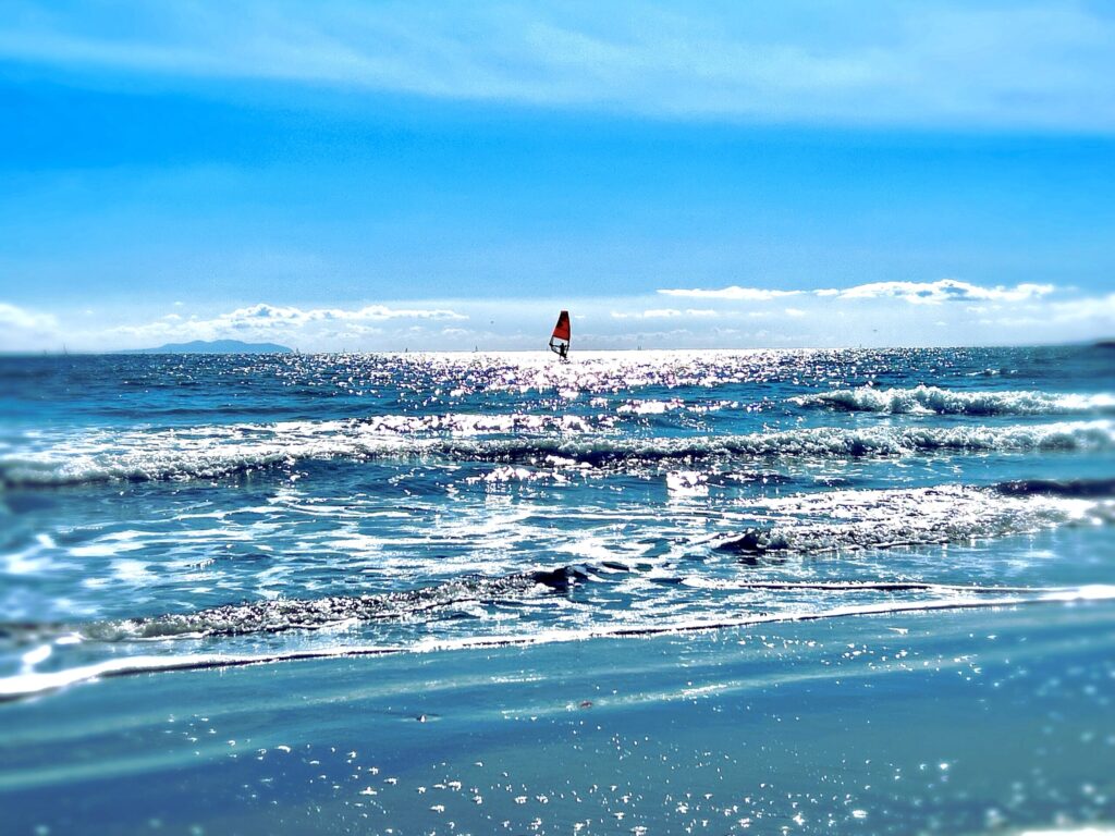 冬の冷たい風をはらみ、ウィンドサーフィンの赤い帆が、広大な青のキャンバスに点を打っていく。