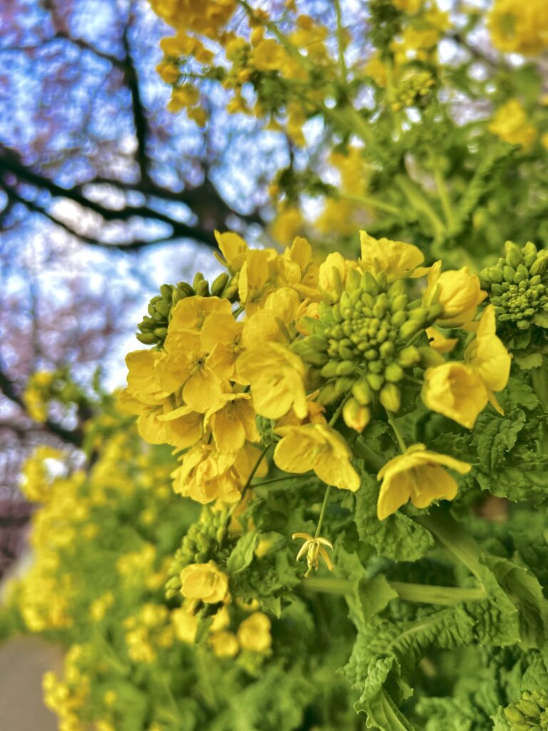 低い位置から見上げると、菜の花が主役になり、背景の桜がふわりと溶ける。