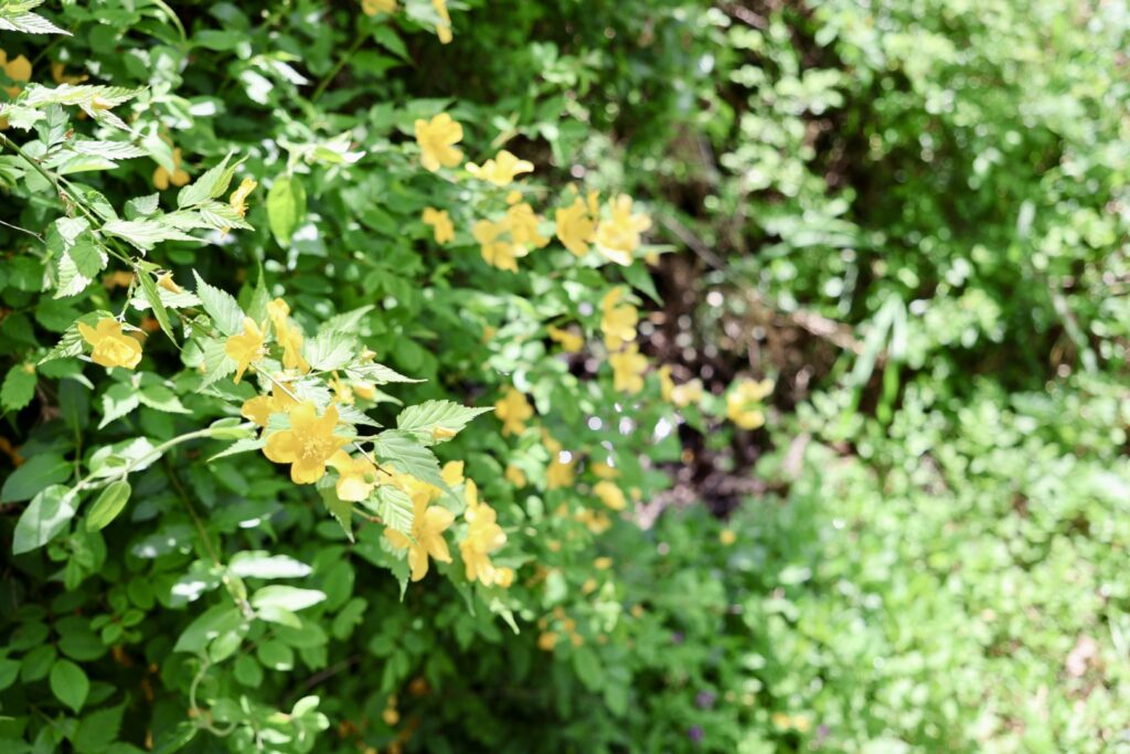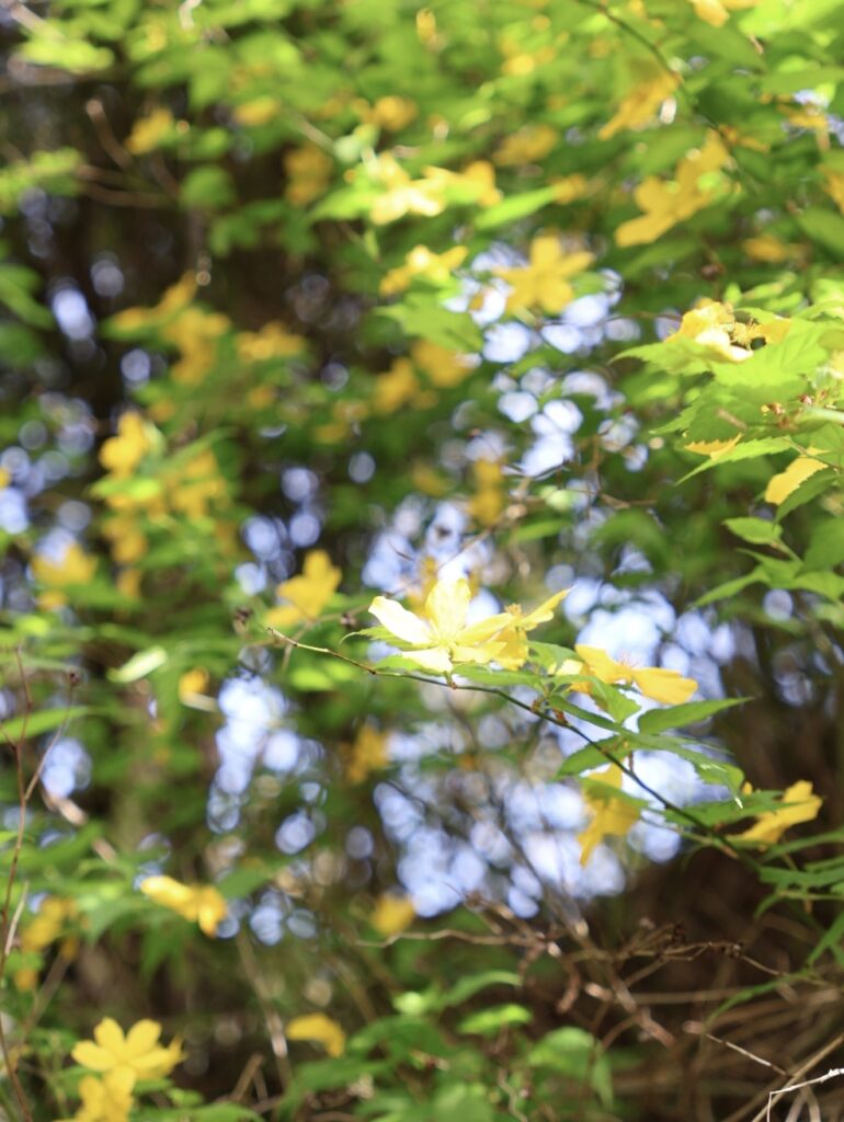遊歩道へと向かう道すがら、光を受けて輝く黄色い花に出会う 。