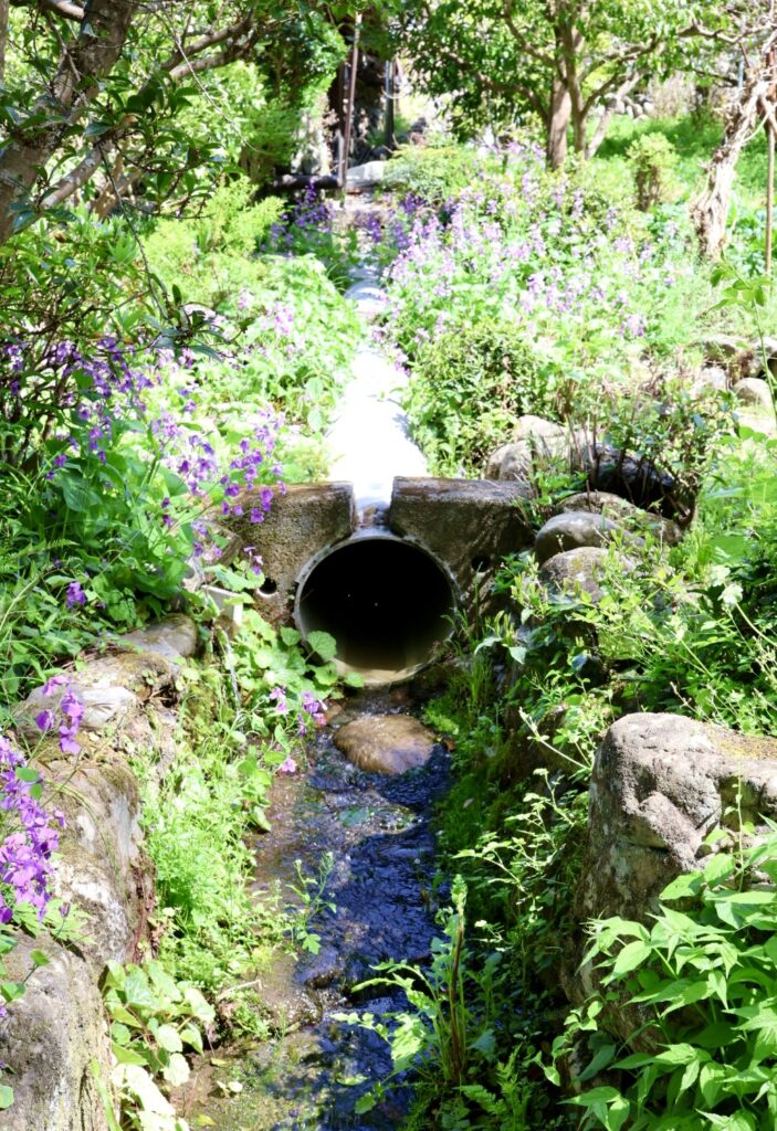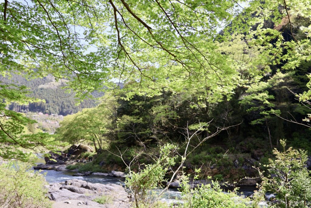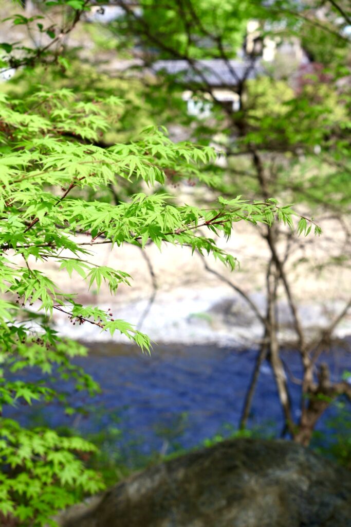 新緑が水面に鮮やかに映り込み、春の光が柔らかく揺れている 。橋を渡り、対岸へ 。