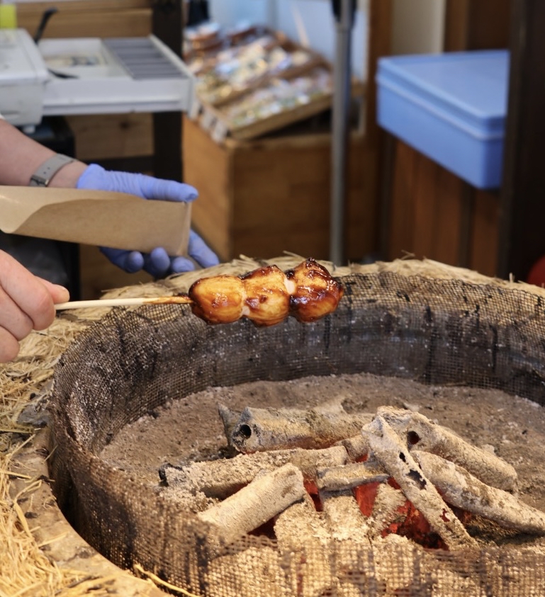 運よく最後の一本に間に合った「クルミ味噌の焼き団子」を頬張る 。香ばしい味噌の香りが、歩き疲れた体に心地よく染み渡った。