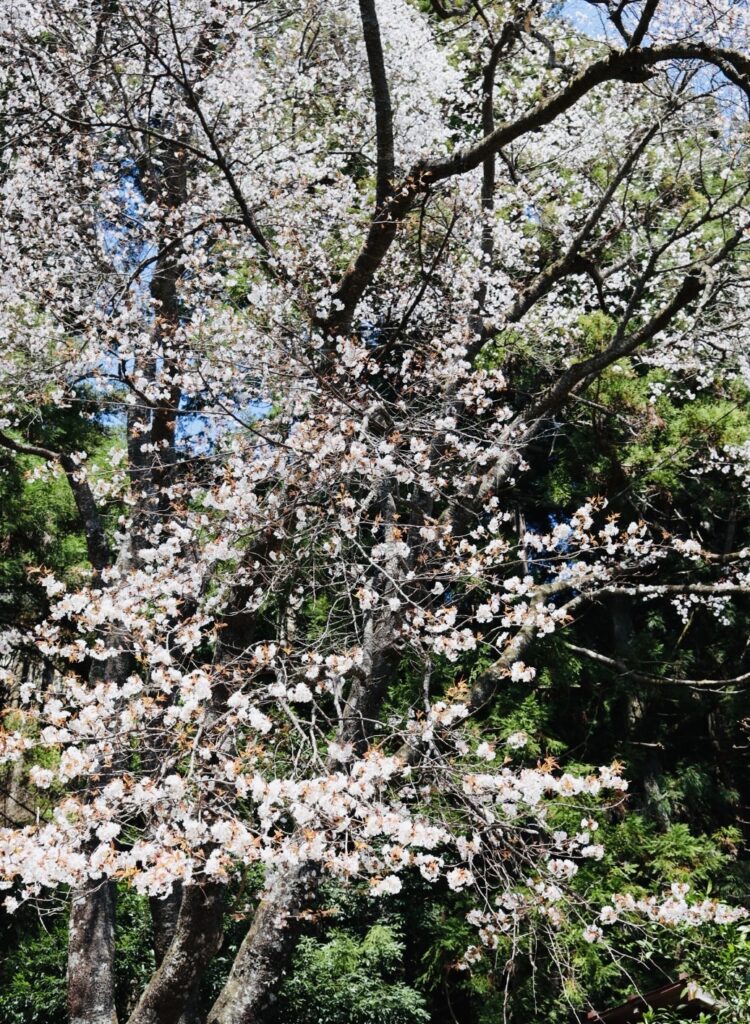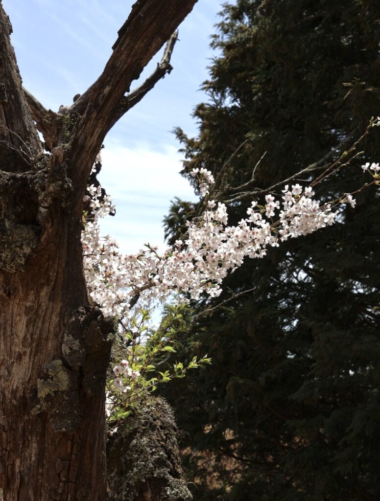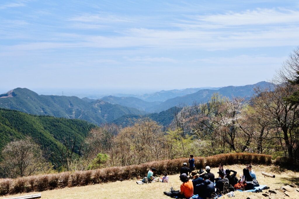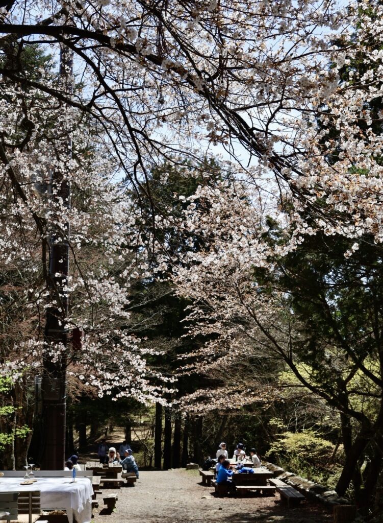 長尾茶屋の近くで寛ぐ人々と、名残惜しそうに咲く桜の景色が、私の心を静かに解きほぐしていく。