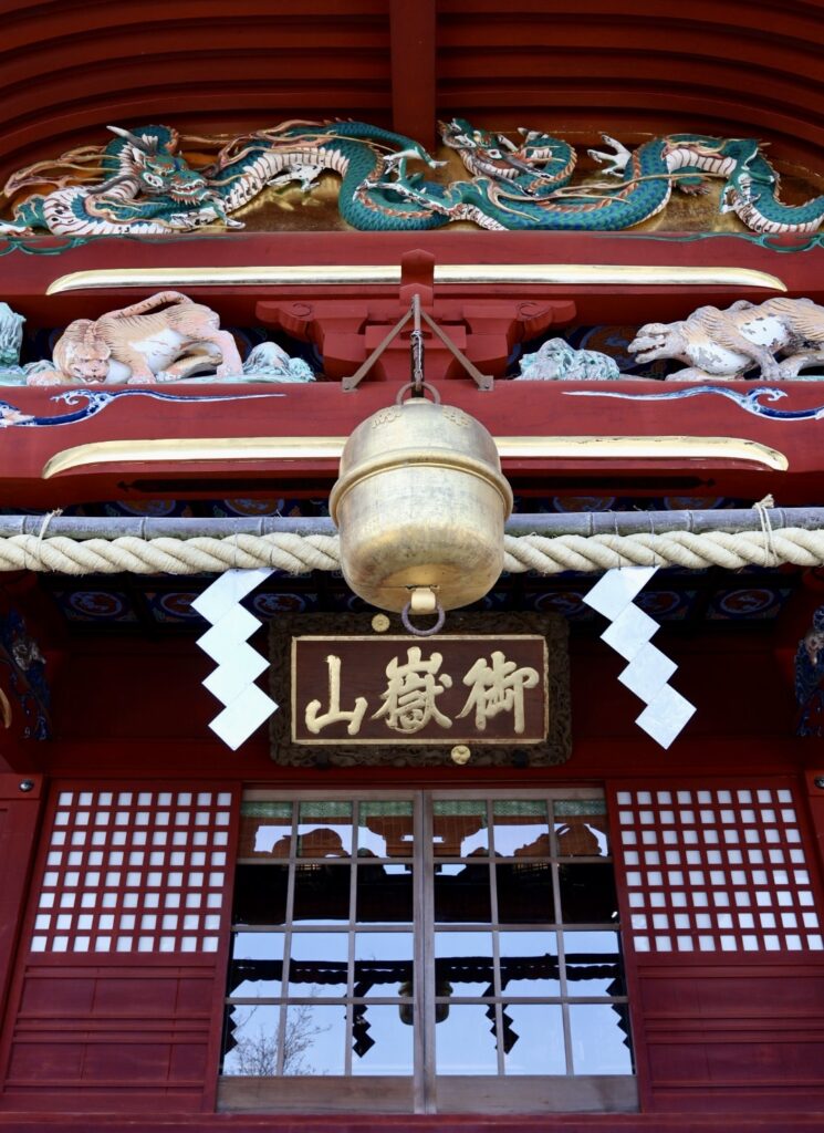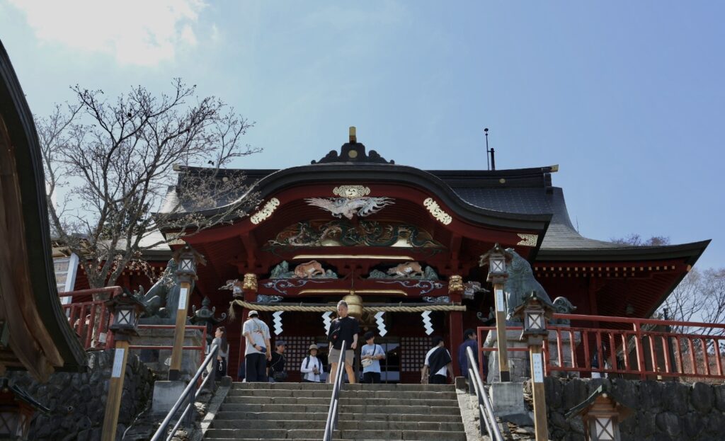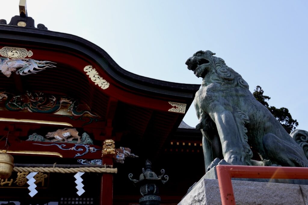 武蔵御嶽神社の本殿や狛犬の姿を写真に収める。